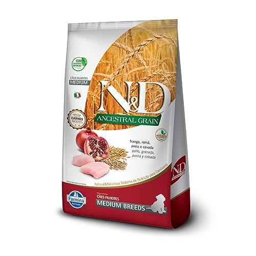 Ração N&D Ancestral Grain Cães Puppy Medium FrangoA Ração N&D Ancestral Grain Cães Puppy Medium Frango é uma ração completa e balanceada, ideal para cães filhotes de raças médias e para cadelas no terço final de gestação e em lactação. Feita com frango, proteína de alto valor biológico, romã e cereais ancestrais como a cevada e aveia.A Ração N&D Ancestral Grain Puppy tem antioxidantes naturais, extratos ricos em tocoferóis, possui um baixo índice glicêmico que permite uma liberação gradual de energia ao longo do dia e ainda é rico em vitaminas.Alimentação de qualidade, você só encontra aqui na Cobasi, e a Ração N&D Ancestral Grain Cães Puppy Medium Frango com ótimo preço. Aproveite e compre agora pelo site, App ou em nossas lojas físicas com ótimas condições.Medida do grãoDiâmetro 9-11mm x Espessura 3-5mmIngredientesCarne de frango (mecanicamente separada), farinha de vísceras de aves (mín. 10%), ovo desidratado, aveia (mín. 1%), sorgo, cevada (mín. 1%), farinha de peixe, óleo de frango, óleo de peixe, polpa de beterraba, casca de ervilha, alfafa desidratada, lignocelulose, semente de psyllium, levedura seca de cervejaria, cenoura desidratada, espinafre desidratado, laranja desidratada, maçã desidratada, blueberry desidratado, extrato de romã (mín. 0,075%), extrato de chá verde, extrato de aloe vera, cúrcuma em pó, beta caroteno, aditivos prebióticos (FOS e MOS), DL-metionina, taurina, L-carnitina, sulfato de condroitina, sulfato de glicosamina, aditivos adsorventes (extrato de yucca e zeolita), hidrolisado de fígado de frango e suíno, vitaminas (A, D3, E, B1, B2, B6, B12, C, biotina, niacina, ácido pantotênico, ácido fólico, cloreto de colina), fosfato bicálcico, cloreto de potássio, ferro aminoácido quelato, cobre aminoácido quelato, zinco aminoácido quelato, manganês aminoácido quelato, proteinato de selênio, iodato de cálcio, propionato de cálcio, concentrado de tocoferóis.Eventuais substitutivos: proteína hidrolisada de peixe, proteína hidrolisada de frango.Níveis de garantia:Umidade (máx.)90 g/kg9%Proteína Bruta (mín.)350 g/kg35%Extrato Etéreo (mín.)200 g/kg20%Matéria Fibrosa (máx.)20 g/kg2%Matéria Mineral (máx.)73 g/kg7,3%Cálcio (mín.)9.000 mg/kg0,9%Cálcio (máx.)14,2 g/kg1,42%Fósforo (mín.)7.500 mg/kg0,75%Sódio (mín.)2.000 mg/kg0,2%Potássio (mín.)5.000 mg/kg0,5%Magnésio (mín.)900 mg/kg0,09%Ômega 6 (mín.)30 g/kg3%Ômega 3 (mín.)3.000 mg/kg0,3%DHA (mín.)700 mg/kg0,07%EPA (mín.)600 mg/kg0,06%Fruto-Oligossacarídeos (mín.)400 mg/kg-Mannan-Oligossacarídeos (mín.)240 mg/kg-Metionina (mín.)6.000 mg/kg-Taurina (mín.)1.000 mg/kg-L-Carnitina (mín.)200 mg/kg-Lisina (mín.)13,5 g/kg-Sulfato de Condroitina (mín.)300 mg/kg-Sulfato de Glicosamina (mín.)350 mg/kg-Energia Metabolizável4.108 kcal/kg-Enriquecimento por Kg:Vitamina A – 16.000UI, Vitamina D3 – 1.600UI, Vitamina E – 600UI, Vitamina B1 – 4,8mg, Vitamina B2 – 8mg, Vitamina B6 – 6,4mg, Vitamina B12 – 64mcg, Vitamina C – 160mg, Biotina – 0,40mg, Niacina – 40mg, Ácido pantotênico – 16mg, Ácido fólico – 0,48mg, Colina – 1.800mg, Ferro – 40mg, Cobre – 13mg, Zinco – 145mg, Manganês – 49mg, Selênio – 0,18mg, Iodo – 1,6mg.Quantidade Recomendada:Peso do cão2 meses3 meses4 meses5-6 meses7-10 meses11-12 meses13-16 meses5 kg60g90g95g115g100gRação adultoRação adulto7,5 kg80g115g115g150g130gRação adultoRação adulto10 kg95g130g140g175g165gRação adultoRação adulto15 kg125g175g185g240g230gRação adultoRação adulto20 kg140g215g230g280g275gRação adultoRação adulto30 kg185g280g300g370g375g360gRação adultoGuia para troca de raçãoCaso haja necessidade em inserir uma nova ração para seu pet, é importante que a troca seja gradual e crescente. Para garantir uma perfeita adaptação e aceitação, você pode seguir a sugestão abaixo ou conforme orientação do médico-veterinário: