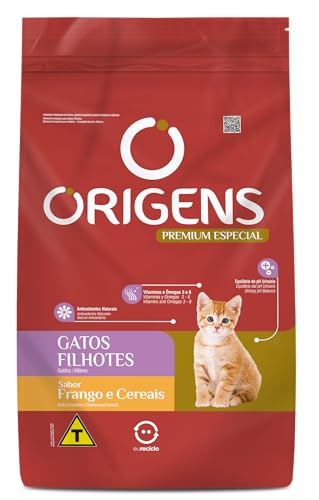 Ração Origens Gatos Filhotes Frango e CereaisCom um paladar mais exigente, os gatos precisam de um alimento que os atenda do jeitinho que eles merecem.A linha Origens Gatos Filhotes Sabor Frango e Cereais possui ingredientes nutritivos e de alta palatabilidade para o seu gatinho degustar as refeições.Possui uma combinação de prebióticos, fibras e extrato de Yucca, que auxiliam no equilíbrio da flora intestinal minimizando o odor das fezes e na eliminação das bolas de pelo.Com Taurina e proteínas, nutrientes essenciais para o metabolismo do felino e níveis de minerais que ajudam a equilibrar o pH urinário. Além de vitaminas e ômegas 3 e 6 para deixar a pele e pelagem muito mais bonitas e brilhantes.Se você quer oferecer uma ração de qualidade para seu amigo peludo, aqui na Cobasi você encontra a Ração Origens Gatos Filhotes com um preço especial.IngredientesFarinha de vísceras de aves, milho moído, proteína isolada de suíno (farinha de torresmo), farelo de glúten de milho-60, polpa desidratada de beterraba, farelo de trigo, óleo de aves, óleo de peixe, hidrolisado de fígado de aves e miúdos de suínos, cloreto de sódio, linhaça, prebióticos (parede celular de levedura, inulina), extrato de yucca, vitaminas, minerais, taurina, ácido fosfórico, metionina, ácido propiônico, ácido cítrico, BHA (Butilhidroxianisol) e BHT (Butilhidroxitolueno).Níveis de garantiaUmidade (máx.)100 g/kg 10%Proteína Bruta (mín.)320 g/kg 32%Extrato Etéreo (mín.)120 g/kg 12%Matéria Fibrosa (máx.)35 g/kg 3,5%Matéria Mineral (máx.)100 g/kg 10%Cálcio(máx.)19 g/kg 1,9%Cálcio(mín.)9.000 mg/kg 0,9%Fósforo/ Phosphorus (mín.)7.000 mg/kg 0,7%Sódio/ Sodium (mín.)2.500 mg/kg Enriquecimento mínimo por kg do produtoVitamina A 10.000UI; Vitamina D3 960UI; Vitamina E 40UI; Vitamina K 1mg; Vitamina B1 5mg; Vitamina B2 4,8mg; Vitamina B6 5,4mg; Vitamina B12 28mcg; Biotina 0,1mg; Ácido Fólico 1,0mg; Ácido Pantotênico 8mg; Niacina 60mg; Colina 320mg; Ferro 80mg; Cobre 7mg; Iodo 0,4mg; Manganês 7,5mg; Zinco 80mg; Zinco Quelatado 50mg; Selênio 0,3mg; Selênio Complexado 0,01mg.Recomendação de consumo diário (g/dia)Idade (meses)Peso do Gato (kg)Quantidade Diária (g)A partir de 2Até 0,70040 – 553 – 41 – 1,560 – 755 – 61,9 – 2,380 – 907 – 82,7 – 3,290 – 959 – 103,6 – 4,195 – 105Guia para troca de raçãoCaso haja necessidade em inserir uma nova ração para seu pet, é importante que a troca seja gradual e crescente. Para garantir uma perfeita adaptação e aceitação, você pode seguir a sugestão abaixo ou conforme orientação do médico-veterinário: