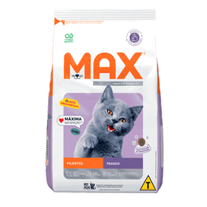Ração Max para Gatos Filhotes FrangoGatos filhotes são muito ativos e adoram explorar lugares e para manter uma vida saudável a Ração Max para Gatos Filhotes Frango foi desenvolvida. Fabricada sem corantes artificiais, é a escolha ideal por ter 100% de aproveitamento.Com um blend de ingredientes de alta palatabilidade, a Ração Max para Filhote de Gato favorece as defesas naturais do organismo auxiliando na saúde intestinal e contribuindo para a redução do odor das fezes. Além disso, a ração dá suporte ao desenvolvimento cerebral para uma vida mais saudável e ativa, contribuindo também para uma pele e pelagem mais bonita.Encontre a maior variedade de alimentos para seu pet como a Ração Max para Gatos Filhotes Frango com preço especial aqui na Cobasi. Compre pelo site, app ou em uma de nossas lojas.IngredientesFarinha de vísceras de aves, farinha de carne e ossos de bovino, farinha de peixe, óleo de aves, óleo de peixes, grão de milho**, farelo de glúten de milho**, grão de sorgo, quirera de arroz, grão de linhaça, farelo de soja*, levedura de cervejaria inativada desidratada, cloreto de sódio, cloreto de potássio, DL-metionina, taurina, cloreto de colina, ácido propiônico, aditivo prebiótico (0,024%), extrato de yucca (0,025%), BHA (Butilhidroxianisol), BHT (Butilhidroxitolueno), bissulfato de sódio, hidrolisado de fígado de suíno, vitamina A, vitamina B1, vitamina B12, vitamina B2, vitamina B6, vitamina B9, vitamina B5, vitamina D3, vitamina H, vitamina K3, vitamina B3, vitamina E, vitamina C, sulfato de ferro, sulfato de cobre, monóxido de manganês, sulfato de zinco, selenito de sódio, iodato de cálcio.Eventuais Substitutos: Hidrolisado de fígado de aves, hidrolizado de Peixe, ácido acético, propionato de amônio.Níveis de GarantiaProteína Bruta (mín)340 g/kg34%Extrato Etéreo (mín)120 g/kg12%Matéria Fibrosa (máx)40 g/kg4%Matéria Mineral (máx)80 g/kg8%Umidade (máx)100 g/kg10%Cálcio (mín)10 g/kg1%Cálcio (máx)15 g/kg1,5%Fósforo (mín)8000 mg/kg0,8%Sódio (mín)2500 mg/kg0,25%Potássio (mín)6000 mg/kg0,6%Metionina (mín.)8000 mg/kg0,8%Taurina (mín.)1300 mg/kg0,13%Mananoligossacarídeos (mín.)240 mg/kg0,024%Ácido linolênico (mín.)2500 mg/kg0,25%Ácido linoleico (mín.)20 g/kg2%DHA (mín)400 mg/kg0,04%Energia metabolizável3.870 kcal/kg-Enriquecimento mínimo por kgVitamina A (10000 U.I.), Vitamina B1 (6,5 mg), Vitamina B12 (20 mcg), Vitamina B2 (6,5 mg), Vitamina B6 (8 mg), Vitamina B9 (1 mg), Vitamina B5 (10 mg), Vitamina D3 (700 U.I.), Vitamina H (0,1 mg), Vitamina K3 (1 mg), Vitamina B3 (70 mg), Vitamina E (450 U.I.), Vitamina C (40 mg), Colina (2400 mg), Cobre (15 mg), Ferro (100 mg), Selênio (0,3 mg), Manganês (20 mg), Zinco (120 mg), Iodo (2 mg).Quantidade recomendadaPeso adulto esperadoIdade em meses2 - 44 - 55 - 77 - 99 - 121 kg22 - 27g27 - 29g29 - 32g32 - 29g29 - 23g2 kg35 - 43g43 - 46g46 - 50g50 - 46g46 - 37g3 kg46 - 57g57 - 60g60 - 66g66 - 60g60 - 48g4 kg56 - 69g69 - 72g72 - 80g80 - 73g60 - 58g5 kg65 - 80g80 - 84g84 - 93g93 - 85g85 - 68g6 kg64 - 91g91 - 95g95 - 105g105 - 96g99 - 77g8 kg89 - 110g110 - 115g115 - 127g127 - 116g116 - 93gObs: 1 xícara = 85 gramas.Guia para troca de raçãoCaso haja necessidade em inserir uma nova ração para seu pet, é importante que a troca seja gradual e crescente. Para garantir uma perfeita adaptação e aceitação, você pode seguir a sugestão abaixo ou conforme orientação do médico-veterinário:
